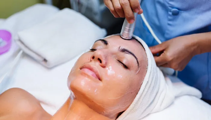 This treatment combines exfoliation, extraction, and infusion of brightening serums: